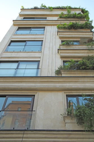 طراح و مجری نما: کرتن وال، کامپوزیت، بخش آجری نما، ترمو وود، فلاورباکس ها، و شیدهای چوبی، پارتیشن چوبی و پنجره ها.
